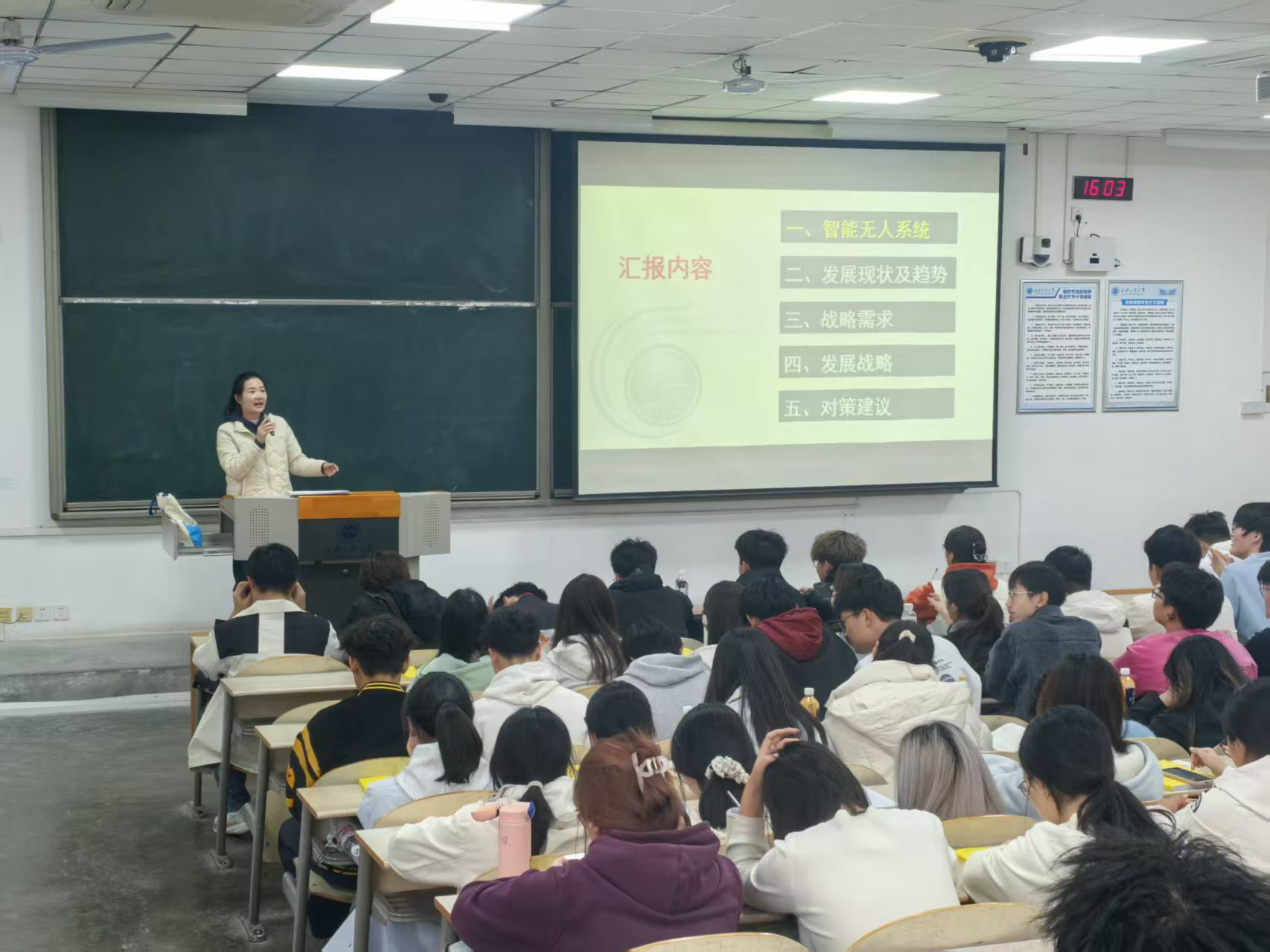 刘露从智能无人系统定义、发展现状及趋势、战略需求、发展战略以及对策建议五个方面展开,深入浅出地介绍了智能无人系统的前沿动态及其在国防现代化与国民经济建设中的战略价值与应用前景。从国家战略需求的高度,分析了该领域未来所面临的机遇与挑战,阐释了兵器科学与智能无人技术深度融合的未来趋势,激发同学们对专业前沿的探索欲和投身国防科技事业的使命感。