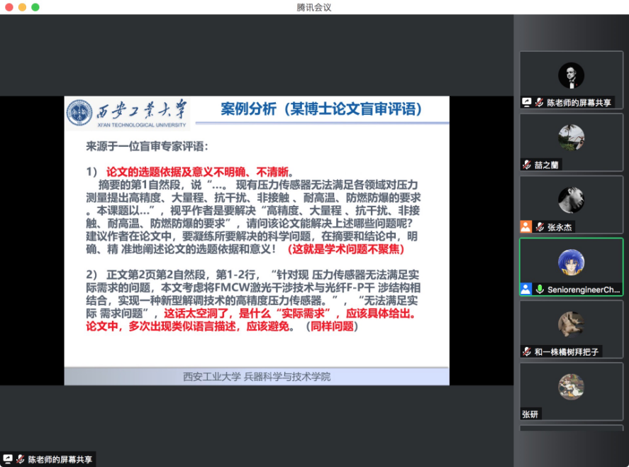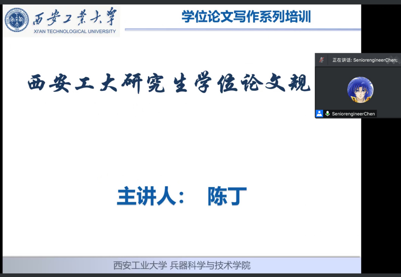 讲座题目:西安工大研究生学位论文规范,主讲人:陈丁,博士、高级工程师、硕士生导师。主要研究方向:兵器数字化试验测试技术、雷达系统总体设计与建模。中国电子学会高级会员、中国仪器仪表学会高级会员、IEEE会员,多个SCI及中文核心期刊评审专家。发表学术论文90余篇,其中SCI、EI收录20余篇。多次获得相关学术会议、科技成果奖。