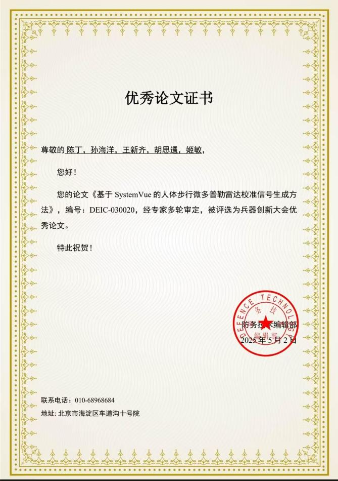 会后,经专家多轮审定,beat365官网23级兵器科学与技术学科硕士研究生孙海洋(第二作者兼通讯作者)撰写的《基于SystemVue的人体步行微多普勒雷达校准信号生成方法》,被评选为兵器创新大会优秀论文。