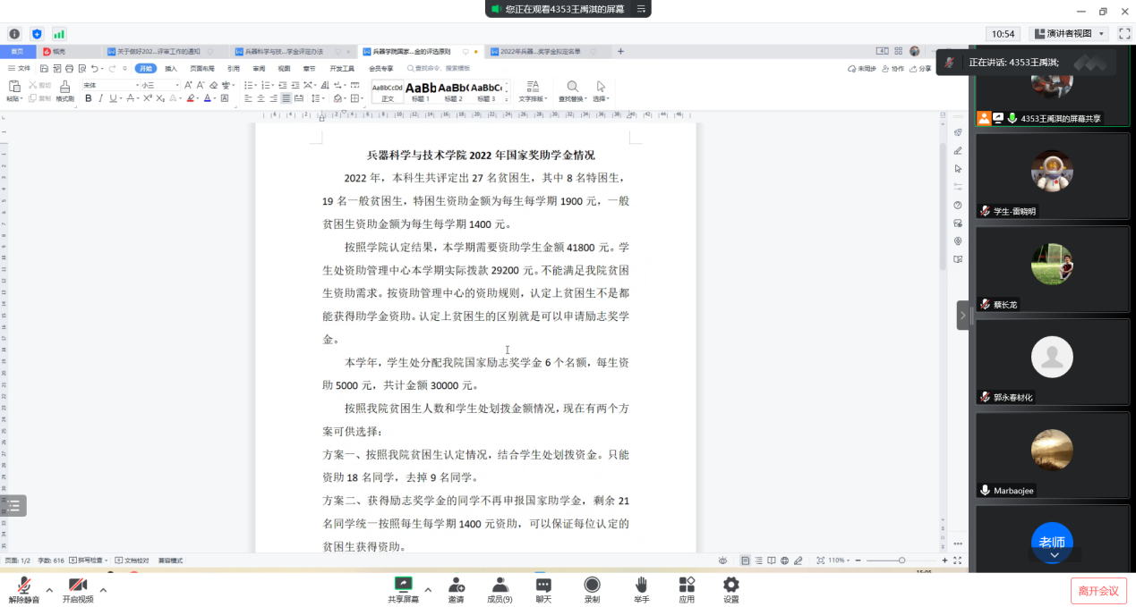 2022年11月4日下午,beat365英国官方网站召开学院奖助委员线上会议,研究并讨论本科生国家助学金和国家奖学金评审原则、普瑞斯企业奖学金评定办法。评审委员会成员马保吉、郭永春、蔡长龙、王春阳、吴杰、霍文俊参与了评审委员会。辅导员王国栋,本科生研究生各一名代表参加了会议,会议由党委书记马保吉主持。