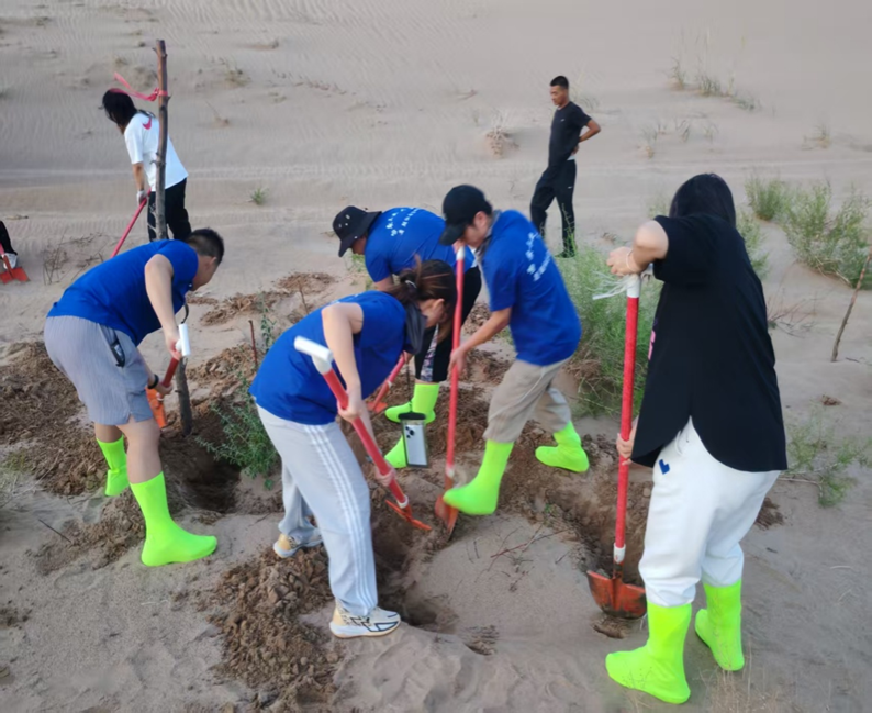 同时,大家也投身于沙漠卫生治理,沿着林地周边仔细捡拾塑料瓶、包装袋等垃圾,将废弃物集中收纳处理,防止污染土地,用双手为这片公益林筑起更洁净的生态屏障。