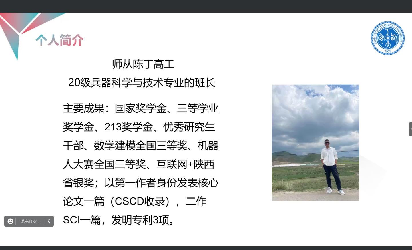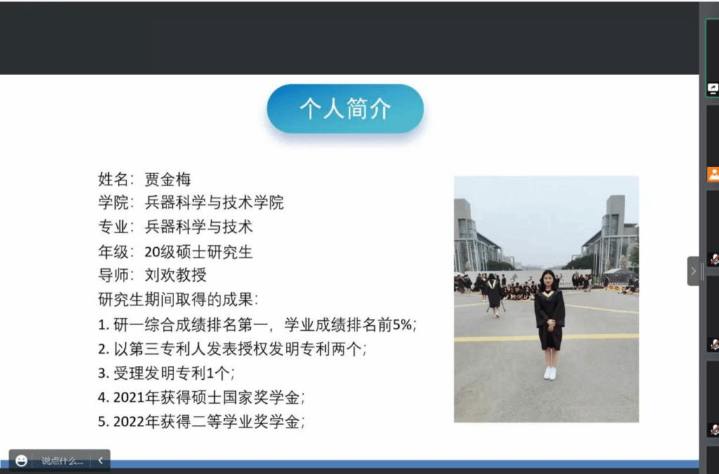为帮助新生规划学业,解答新生在学习上的疑惑,beat365英国官方网站于2022年9月23日19:00在线上举办了“国家奖学金”获得者交流报告会,参会人员有研究生辅导员王国栋、2022级全体研究生、国家奖学金获得者贾金梅、牧迪和雷晓明。