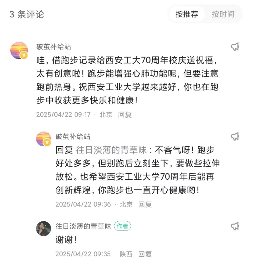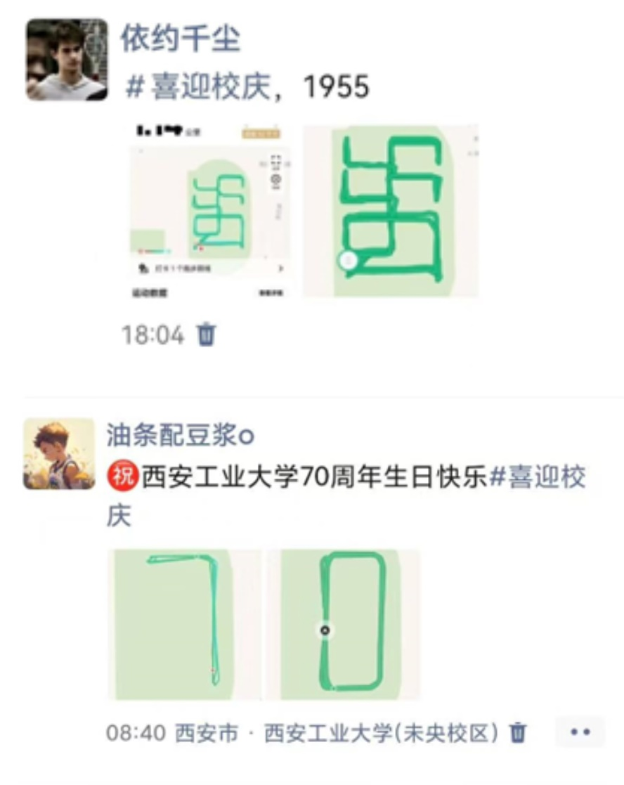 活动以"喜迎七十周年校庆"为主题,鼓励参与者通过跑步轨迹设计富有寓意的图案,在田径场、樱花大道等标志性区域展开创意奔跑。有人用脚步勾勒出"70"的磅礴数字,有人拼出"XATU"的校徽缩写,更有团队协作完成"1955-2025"的时空跨越组图,每个轨迹都凝聚着学子对母校的深情。